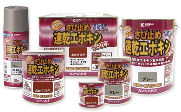 - 防サビ顔料とエポキシ樹脂により密着性・防錆力がUPします。長期間サビの発生を防ぎます。