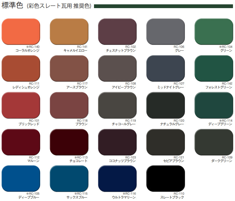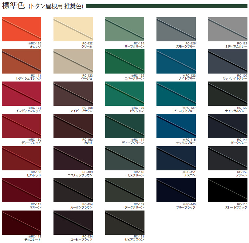 標準24色(彩色スレート瓦用 推奨色)、標準33色(トタン屋根用 推奨色)※2025年時点